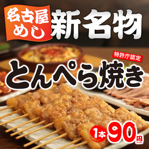 とんぺら屋名物のとんぺら焼きは1本90円(税込99円)!クセになる味はついつい追加注文するお客様続出♪1本10万円の高麗人参エキスを抽出し開発に半年かけた自家製の美味しいタレが抜群の旨みを引きだします。スパイスには塩分0%の自家製大豆粉末を使用。身体にも良い逸品です。