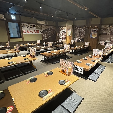 【とんぺら屋で過ごす想い出の時間】気取らないワイガヤ感が楽しいテーブル席は、いつも賑わっていて活気で溢れています☆テーブルをつなげると大人数でもお座りいただけるのでご安心ください