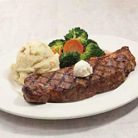 ストリップステーキをチャコールでグリル、マッシュポテトと温野菜添え。