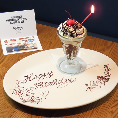 記念日のお祝いには、ギター型ケーキやワクワクするサプライズ演出もご用意しております♪迫力あるボリュームのアメリカン料理と、ハードロックカフェならではのエネルギッシュな空間で、特別なひとときを演出。自慢の人気メニューをお得に楽しめるパーティーコースも幅広くご用意しております!