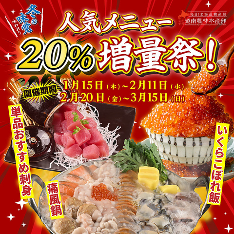 2/20~3/15は「増量祭」を開催!痛風鍋やいくらこぼれ飯、おすすめ刺身を20%増量!今だけの特別盛りです♪