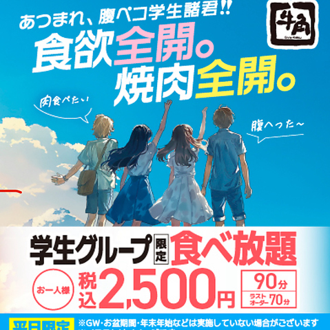 学生必見!!学生グループ限定の50品食べ放題を準備しました♪焼肉はやっぱり牛角!
