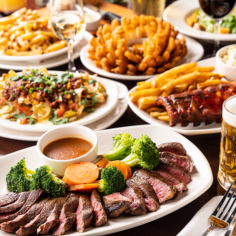全てがアメリカンサイズだから楽しい!ステーキなど自慢の料理はもちろん、サイドメニューも充実。フライドオニオンやナチョスまで、ビッグサイズをぜひシェアしてお楽しみください。