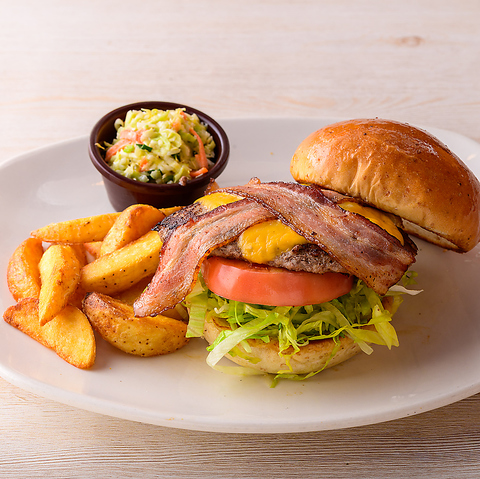 フライドポテトとコールスロー付き!ベーコンとチーズとトッピングした、人気No.1のハンバーガー。