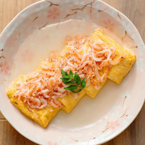 海鮮居酒屋のだし巻!旬の桜海老あんたっぷりの期間限定です!日本酒に合うイカマヨも絶品♪