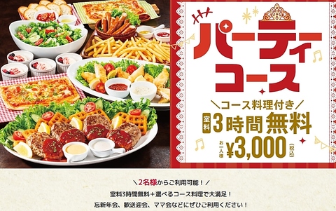 3名様からご利用できるパーティーコース!3時間室料無料とお食事が付いてなんと1人2500円(税込)思いっきり食べたい人も、歌いたい人も使い方いろいろ。ごゆっくりとお過ごしいただけます。
