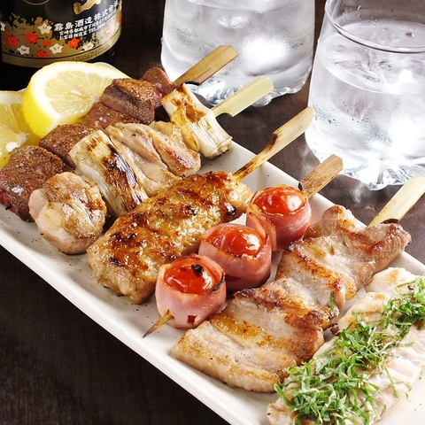 当店大人気メニュー!ねぎま、ささみ、つくね、トマトベーコン、豚バラ、豚レバー6種類人気焼きとり盛り合わせ、定番です。