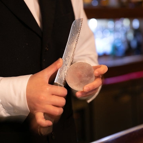 「グラスに感動を注ぎ、お皿に感動を盛り付けたい」をモットーに、感動をサービスするバーテンダーを目指しています。製氷機で作った氷ではお客様に感動を与えられないと考え、一日寝かせて締めた氷を削り、千葉では珍しかった丸い氷のオンザロックをご提供します。手間を惜しまないプロの技をご堪能ください。