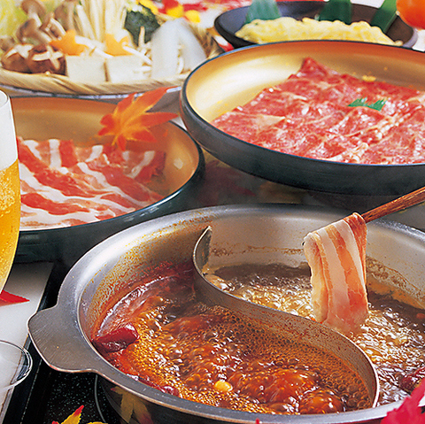 話題の火鍋を食べ放題で堪能♪【ロース牛】 +【豚肉】/【上牛肉】 +【国産豚肉】/【特選和牛+黒豚】の3種からお好みのコースをお選びいただけます!キンキンに冷えたビールとも相性抜群です!詳細はコースページよりご確認ください◎