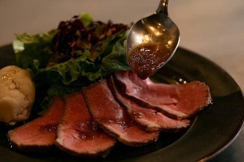 しっとり滑らかな食感が特徴のローストビーフは、当店の自慢の一品です。厳選された肉を使用し、じっくりと焼き上げることで、肉本来の旨味を引き出しました。厚みのあるカットで、食べ応えも抜群!特製の自家製ソースで風味豊かな味わいを引き立てます。シェアして楽しむのもおすすめで、友人や家族と一緒に、心ゆくまでご堪能いただけます。