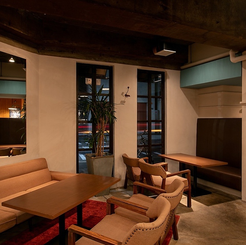 人気のソファー席。女子会やデートなど、女性人気のあるお席となっております。ゆったり座って喋ってお酒を楽しめます。NYのダウンタウンをイメージした店内。パーティーやデートにも使えるオシャレな落ち着いた空間です。