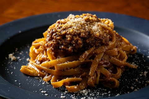 美味しく仕上げた数種類のパスタをご用意しています。麺は食べ応えのあるタリアテッレを使用し、ソースとの相性が抜群!もちもち食感がソースをしっかりと絡め、満足感のある一皿に仕上げています。写真の「雪山チーズの牛挽肉のボロネーゼ」は、じっくり煮込んだ牛挽肉と特製トマトソースにチーズが絶妙に調和し、深い味わいを楽しめます。
