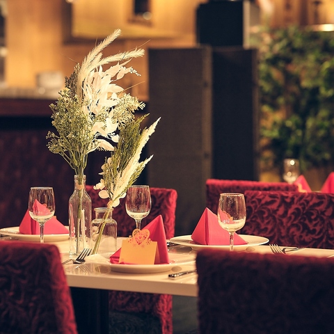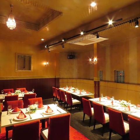 1Fフロア天井中央の巨大シャンデリアをはじめ、店内の至る所にキラキラと輝くクリスタルのシャンデリアが飾ってあります。さらに各テーブルの上にはゆらゆらと優しい光が揺らめくアルコールランプを置いてあります。お友達同士での女子会や、カップルでのデートにもぴったりな雰囲気です♪