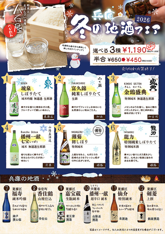 | 【兵庫の地酒】 | 香住鶴 山廃仕込/嘉宝蔵 生もと純米/仙介 特別純米/播州一献 超辛口 純米/福寿 純米吟醸/菊正宗 純米原酒/季節限定の地酒6種 |