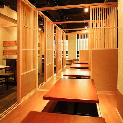 ずらっと並ぶ個室はゆったり落ち着く和の空間。2名から人数に応じて仕切れます。