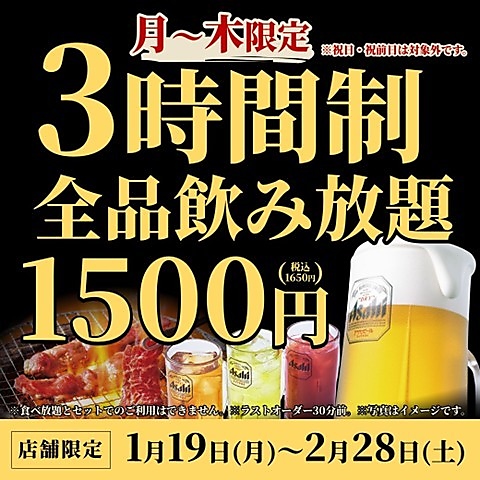 【1/19~2/28横浜北口店/保土ヶ谷店/杉田店】月~木だけ 180分飲み放題フェア開催
