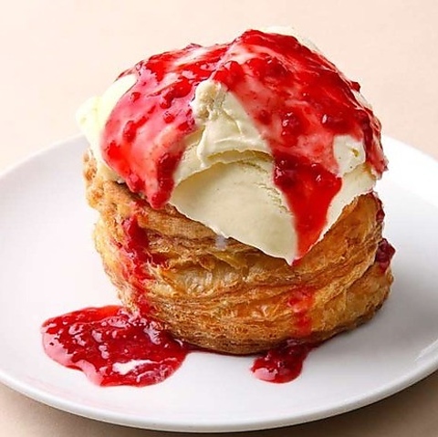 100%国産のりんごを使用した焼きたてアツアツのアップルパイの上に冷た~いアイスクリームをのせて、さらにその上にお好みのソースをかけて召し上がっていただく温かさと冷たさのハーモニーがたまらないデザートです。ソースは、ブルーベリー・ラズベリー・キャラメル・チョコレート・メープルシロップ・シナモンの6種類からお選びください♪