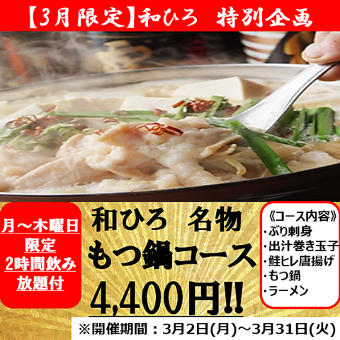 3月の月~木曜日限定で、和ひろ名物 もつ鍋コースを4,400円でご案内!圧倒的コスパで要予約です!