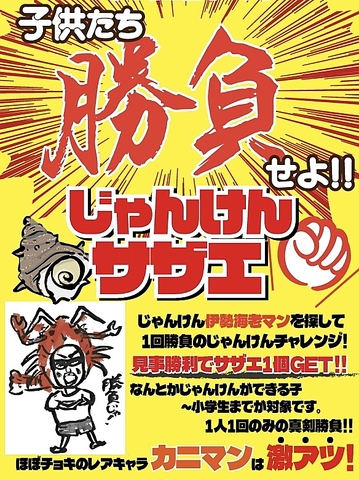 あのジャンケンマンが帰ってくる?!ざうお綱島店でジャンケンマンを探し出し勝負を挑もう!!神出鬼没のジャンケンマンに見事勝利でサザエゲットのチャンス!!(小学生以下のお子様限定のイベントです)