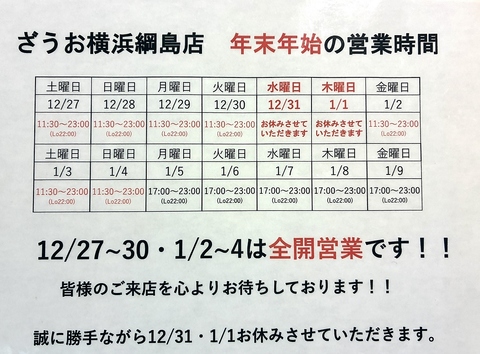 12/27~30は11:30~23:00、12/31・1/1はお休みさせていただきます。1/2~4は11:30~23:00