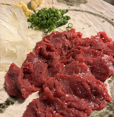 流通過程で一度も冷凍していない【生】馬刺しは山梨県にて仕入れをしています。おすすめメニューに登場していたら、ぜひ一度ご賞味ください!