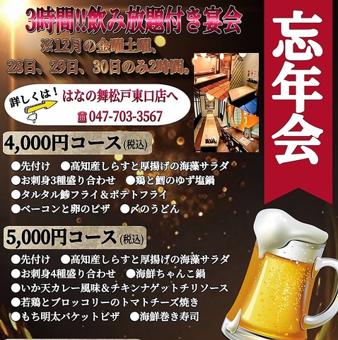 久しぶりに会食する仲間とご堪能ください!当店の定番の3時間飲み放題付き☆短くすることももちろんOK◎2名~ご対応♪宴会・飲み会ははなの舞で決まり!!※写真はイメージです。