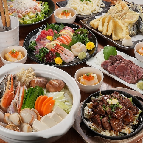早期予約でお得!11月13日~12月14日の日曜~木曜日はなんと!クーポン利用でお一人様バッサリと1000円OFF!豊洲直送の本鮪入り刺身6種盛合わせや、馬肉のタタキ、牛一口ステーキ、海老とキスと野菜の天ぷら盛り合わせ!選べる鍋で黒毛和牛こうね鍋と本ズワイガニ入海鮮鍋と国産牛もつ鍋の3種類!豪華で満足いく内容です!