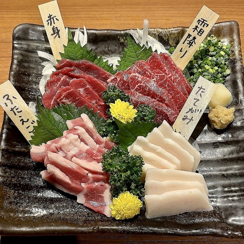 吟味して熊本kら取り寄せています日本各地の気候風土で造られた日本酒とも相性バッチリな馬刺し。是非ご賞味下さい。