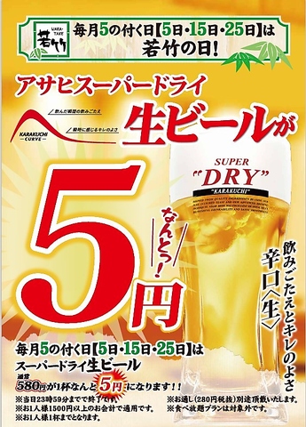 なんと5日・15日・25日はアサヒスーパードライ生ビール中ジョッキが1杯誰でも【5円】になります!!詳しくは当店スタッフまで♪毎月5の付く日はお得しちゃおう♪