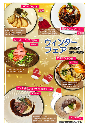 毎日来ても飽きがこない!!今月はウィンターフェアを開催しております。当店お勧めの品を各種ご用意。肉バルでの冬の味覚の数々をこの機会にぜひご堪能下さい♪