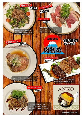 毎日来ても飽きがこない!!今月は肉初めを開催しております。当店お勧めの品を各種ご用意。肉バルでの冬の味覚の数々をこの機会にぜひご堪能下さい♪