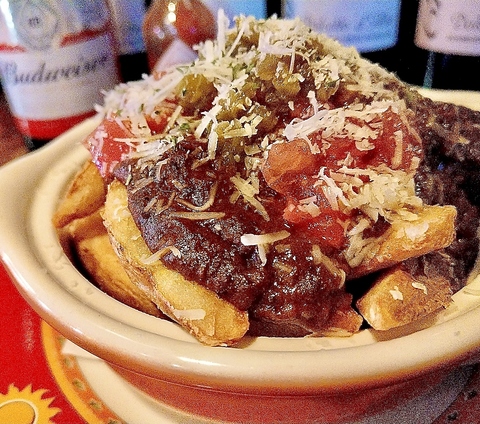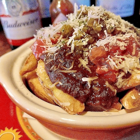 自家製のチリソースを、サックリと揚がったポテトにのせて♪食べだしたら、とまらなくなるポテト