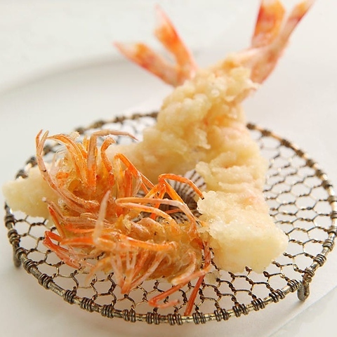 生け簀から揚げたばかりの車海老を目の前で捌き、天ぷらに仕立てます。香り豊かな愛知県蒲郡産の太白『白胡麻油』で揚げることで、外はカリッと、中はふっくらとした食感に。大切な接待などにご利用ください。