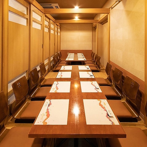 【掘りごたつ席は宴会にも対応可】掘りごたつ席は、個室の仕切りを取り外すことで最大36名様までご利用いただけます。会社宴会や同窓会など、大人数のお食事シーンにもぴったり。逸品料理とともに楽しいひとときをお過ごしください。