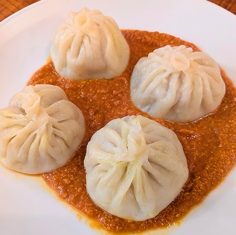 スパイスで味付けした鶏肉と羊肉の合挽き肉を、小麦粉の皮で包んで蒸しています。 トマトの酸味と胡麻の風味、シナモンやカルダモンが香るトマトソースをたっぷりつけてお食べください。
