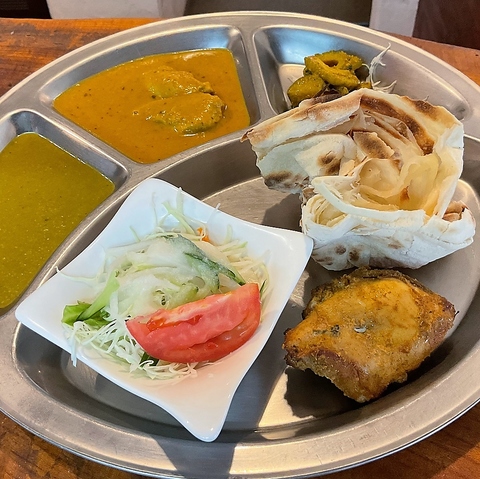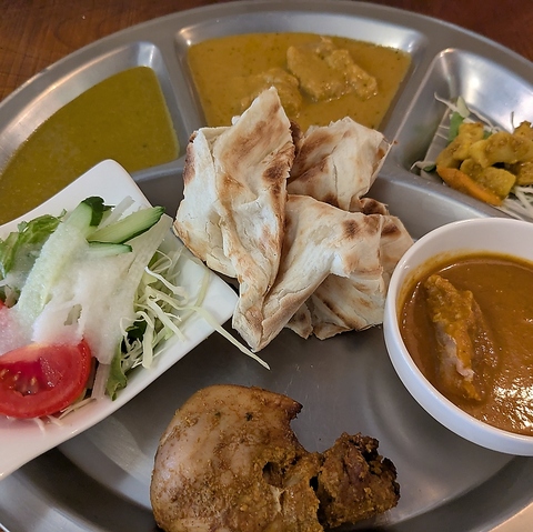 ・タマネギすりおろし自家製ドレッシングの生野菜サラダ・ネパールのピクルス・かまどで焼き立て柔らかくてジューシーなタンドリーチキン・野菜の甘みを感じる絶品カレー3種・サクッとパリッともっちりとした大好評自家製パン「パロタ」またはタイの高級米「ジャスミンライス」