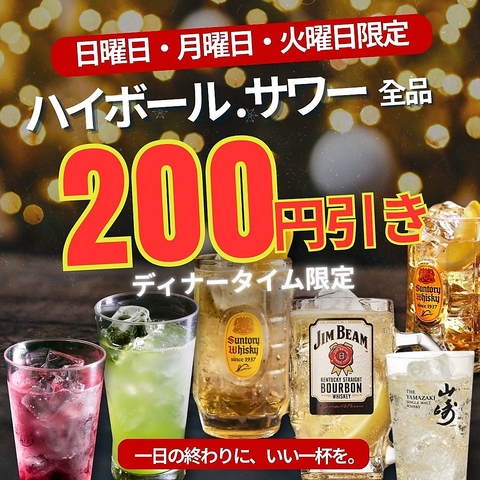 【日~火曜限定】ディナータイムはハイボール&サワー全品200円引き。一日の終わりに、いい一杯を。