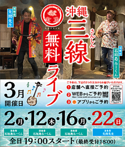 プロの三線奏者による三線と沖縄民謡の生ライブを毎週開催!演奏を聴けば沖縄気分を満喫できます♪♪