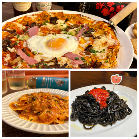 月見ピッツァビスマルク 1,800円 木の子とラグー(豚ひき肉)の平麺パスタ トマトクリームソース 1,500円