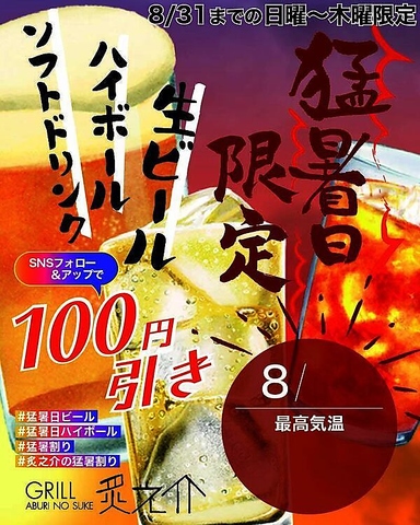 8/31までの日曜~木曜の猛暑日限定★SNSフォロー&投稿で生ビール ハイボール ソフトドリンク100円引き!