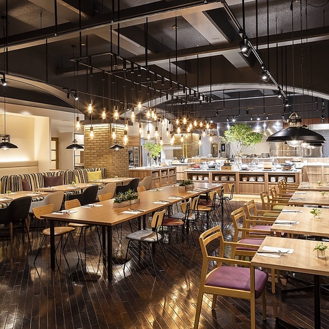 ライブ感あふれるオールダイニング。アツアツグリルを実演します!オシャレな店内にずらりと並ぶお料理は選ぶのも、食べるのも楽しい。