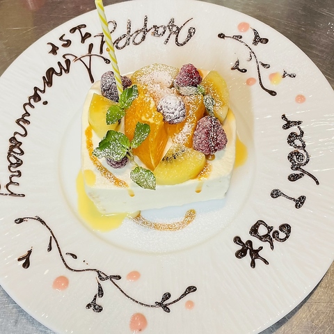 お誕生日や記念日に、可愛いホールケーキをお作りします!2名様~コースご予約でプレゼント♪苦手なフルーツなどもご相談下さい。本日のデザートの盛り合わせで作るデザートプレートも御座います。