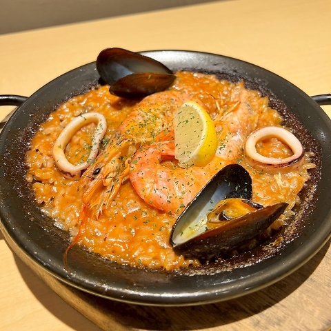 「魚介の旨味が米に染み渡る、至福の一品」魚介の旨味がぎゅっと詰まった、地中海の風を感じる一皿です。レモンを添えて、爽やかなアクセントをどうぞ。