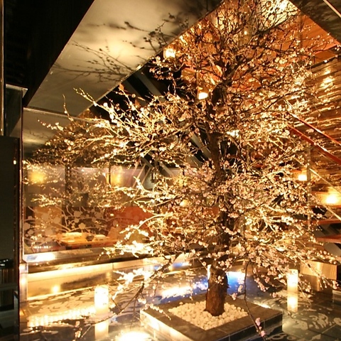【駅近で高クオリティの個室空間】当店のエントランスには幻想的な梅の木があり、非日常空間がお客様を出迎えます。華やかながらも落ち着きある内装が、ウメ子の家の自慢です。