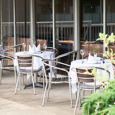 落ち着いた店内は、広々としたテラス席が全面に見渡せる開放的な空間です。