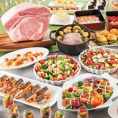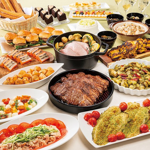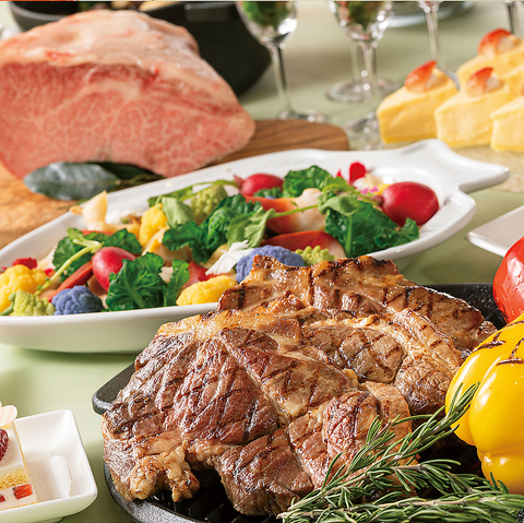 最上部位であるサーロインはかむたびに赤身と脂の旨味が感じられ、強い火力で表面をカリッと、中はやわらかく焼き上げます。その他、オードブルや温製料理、サラダバー、温野菜やスイーツをビュッフェスタイルでお楽しみください。