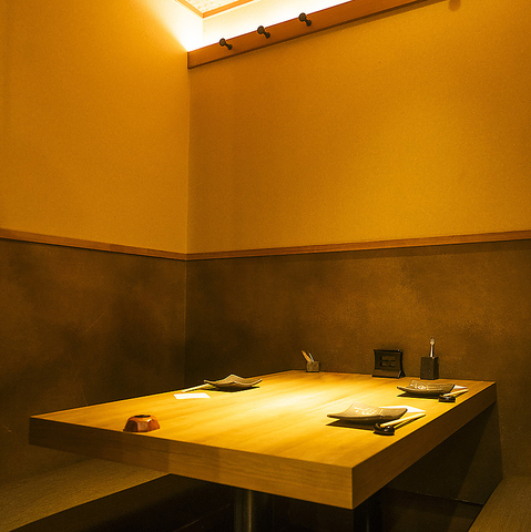 【デート・2名様に人気】隣のテーブルから区切られた2人掛けテーブル席。目隠しバッチリなので、安心して他の人の視線を気にせずお過ごしください。大阪・難波で恋人に最高の地鶏を楽しんでもらいたい方は、是非「車」をご利用ください。