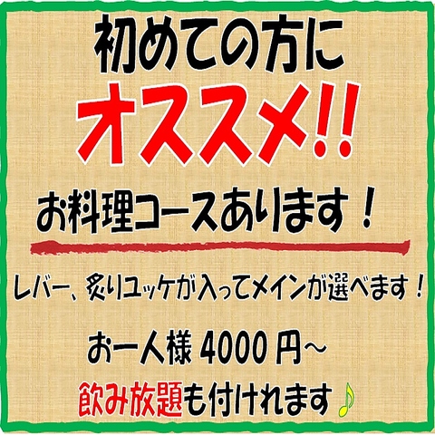 +2000円で2時間の飲み放題も付けれます!特選レバー、和牛炙りユッケが盛り込まれた満足する内容です!!
