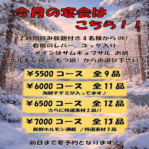 当日のご利用もOK!幸喜屋の人気メニューが目白押し!特選レバー、和牛炙りユッケが盛り込まれた満足する内容です!!+2000円で2時間の飲み放題も付けれます!!