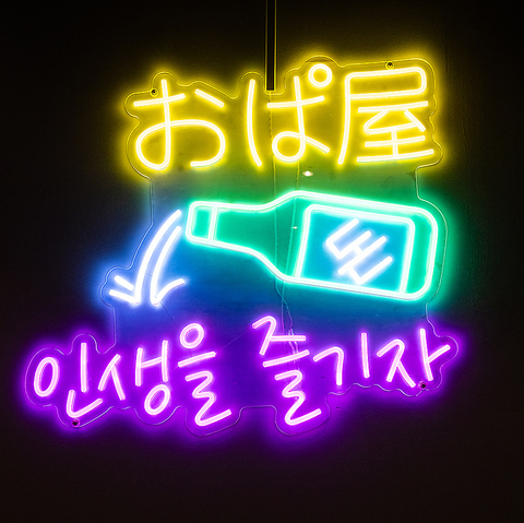 ネオンが映える店内は、黄色の「おぱ屋」ロゴと緑のボトルが印象的。写真映え抜群の空間で、遊び心とおしゃれが融合。SNSで話題の“映える”ひとときを。
